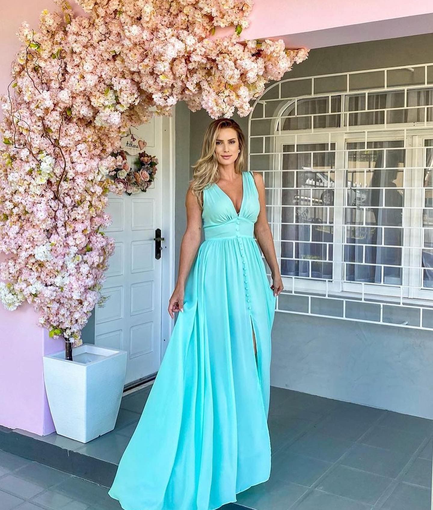 Vestido em crepe de seda , na paleta do verde menta e do verde tiffany